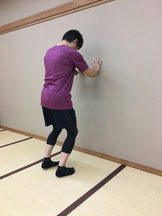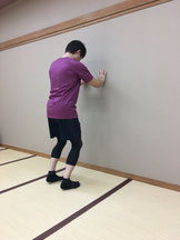 ➀踵を少し浮かし、膝を緩めて壁に手を当てます