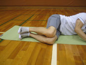 体を横に向け上側の足首に手をかけ、ひざを後方へ引くもも前