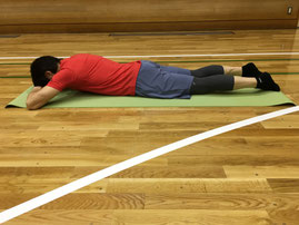 ①うつ伏せになり、左右の手を顔下で重ね手の甲へ額を載せます
