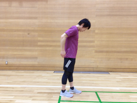 ①腰幅に立ち、少し前傾した姿勢をとり頭を前に垂らします